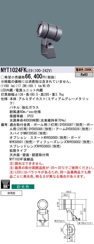 天井直付型・壁直付型・据置取付型 LED(電球色) スポットライト 彩光色・上方向ビーム角54度・拡散タイプ 防雨型 パネル付型 ミニハロゲン電球250形1灯器具相当/ミニハロゲン電球150形1灯器具相当/CDM-T35形1灯器具相当
