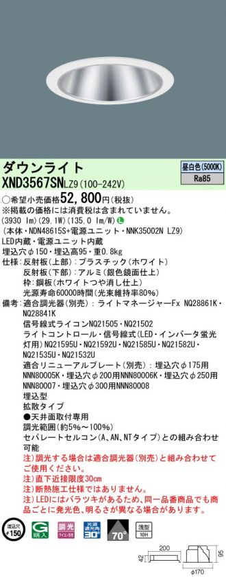 天井埋込型 LED(昼白色) ダウンライト 浅型10H・ビーム角70度・拡散タイプ・光源遮光角30度 調光タイプ(ライコン別売)/埋込穴φ150 CDM-R70形1灯器具相当 LED 350形(NDN48615S+NNK35002NLZ9)