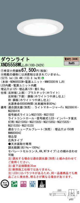 【代金引換不可】天井埋込型 LED(電球色) ダウンライト ビーム角50度・広角タイプ・光源遮光角15度 調光タイプ(ライコン別売)/埋込穴φ125 コンパクト形蛍光灯FHT42形3灯器具相当 LED 550形(NDN68503W+NNK55001NLJ9)