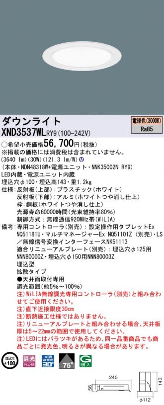 天井埋込型 LED(電球色) ダウンライト ビーム角75度・拡散タイプ・光源遮光角30度 調光タイプ(ライコン別売)/埋込穴φ100 CDM-R70形1灯器具相当 LED 350形(NDN48318W+NNK35002NRY9)
