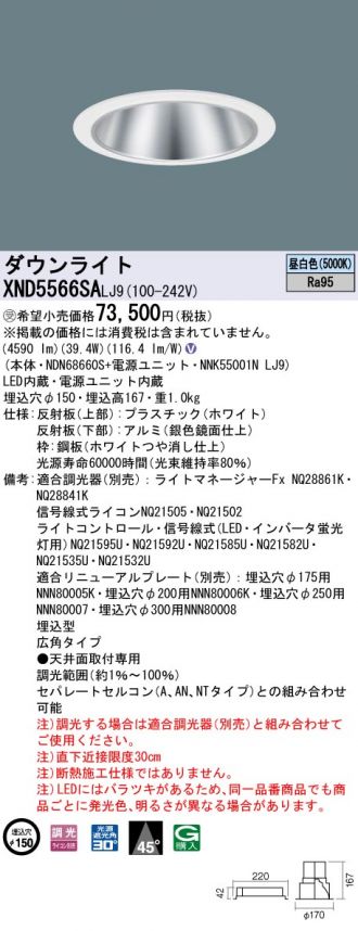 【代金引換不可】天井埋込型 LED(昼白色) ダウンライト 高演色タイプ・ビーム角45度・広角タイプ・光源遮光角30度 調光タイプ(ライコン別売)/埋込穴φ150 コンパクト形蛍光灯FHT42形3灯器具相当 LED 550形(NDN68660S+NNK55001NLJ9)