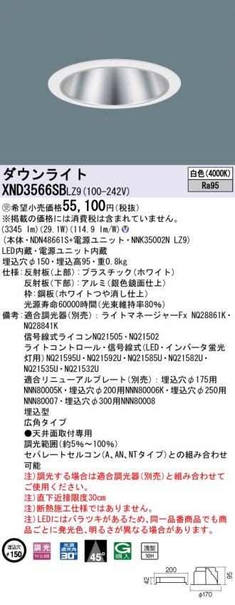 【代金引換不可】天井埋込型 LED(白色) ダウンライト 高演色タイプ・浅型10H・ビーム角45度・広角タイプ・光源遮光角30度 調光タイプ(ライコン別売)/埋込穴φ150 CDM-R70形1灯器具相当 LED 350形(NDN48661S+NNK35002NLZ9)