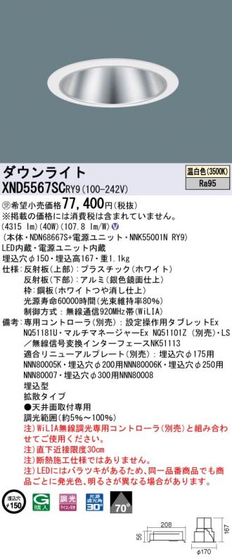 【代金引換不可】天井埋込型 LED(温白色) ダウンライト 高演色タイプ・ビーム角70度・拡散タイプ・光源遮光角30度 調光タイプ(ライコン別売)/埋込穴φ150 コンパクト形蛍光灯FHT42形3灯器具相当 LED 550形(NDN68667S+NNK55001NRY9)