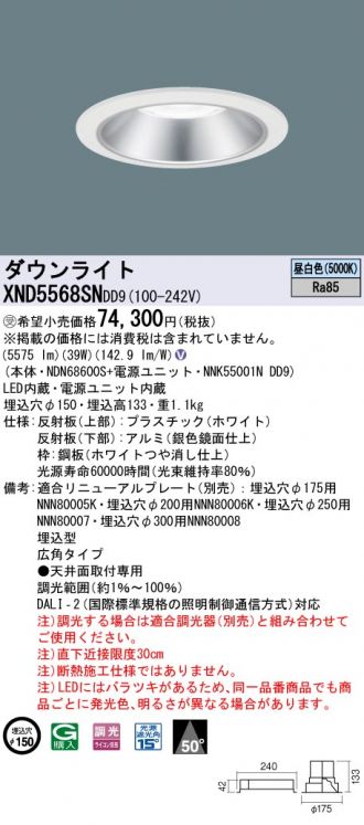 【代金引換不可】天井埋込型 LED(昼白色) ダウンライト ビーム角50度・広角タイプ・光源遮光角15度 調光タイプ(ライコン別売)/埋込穴φ150 コンパクト形蛍光灯FHT42形3灯器具相当 LED 550形(NDN68600S+NNK55001NDD9)