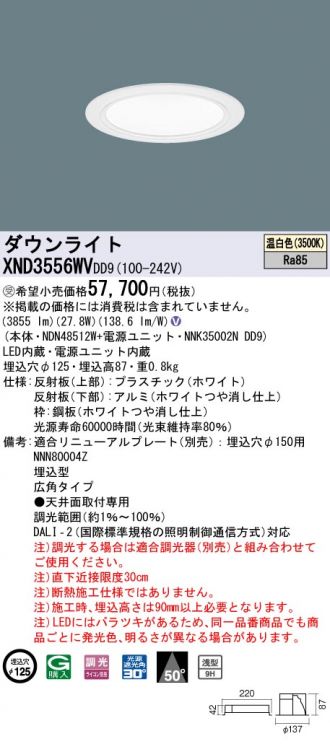 【代金引換不可】天井埋込型 LED(温白色) ダウンライト 浅型9H・ビーム角50度・広角タイプ・光源遮光角30度 調光タイプ(ライコン別売)/埋込穴φ125 CDM-R70形1灯器具相当 LED 350形(NDN48512W+NNK35002NDD9)