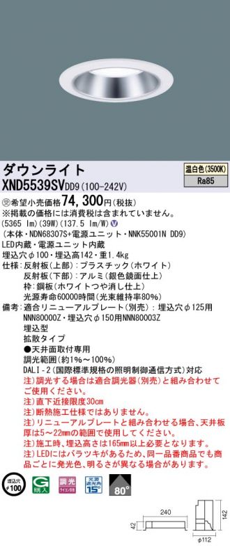 【代金引換不可】天井埋込型 LED(温白色) ダウンライト ビーム角80度・拡散タイプ・光源遮光角15度 調光タイプ(ライコン別売)/埋込穴φ100 コンパクト形蛍光灯FHT42形3灯器具相当 LED 550形(NDN68307S+NNK55001NDD9)