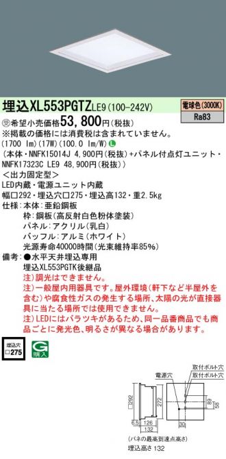 【代金引換不可】天井埋込型 LED(電球色) 一体型LEDベースライト 乳白パネル 深枠(白)タイプ スクエアタイプ/パネル付型 コンパクト形蛍光灯FHP23形3灯器具相当 FHP23形3灯(NNFK15014J+NNFK17323CLE9)