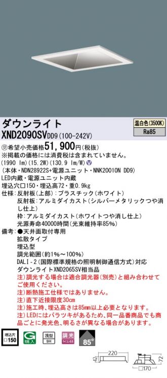 【代金引換不可】天井埋込型 LED(温白色) 角型ダウンライト 浅型9H・ビーム角85度・拡散タイプ 調光タイプ(ライコン別売)/埋込穴□150 コンパクト形蛍光灯FHT42形1灯器具相当 LED 200形(NDN28922S+NNK20010NDD9)