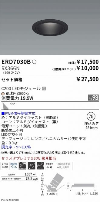 ユニバーサルダウンライト ブラックコーン Φ75(ERD7030B+RX366N)