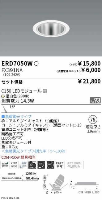 ユニバーサルダウンライト 鏡面マットコーン Φ75(ERD7050W+FX391NA)