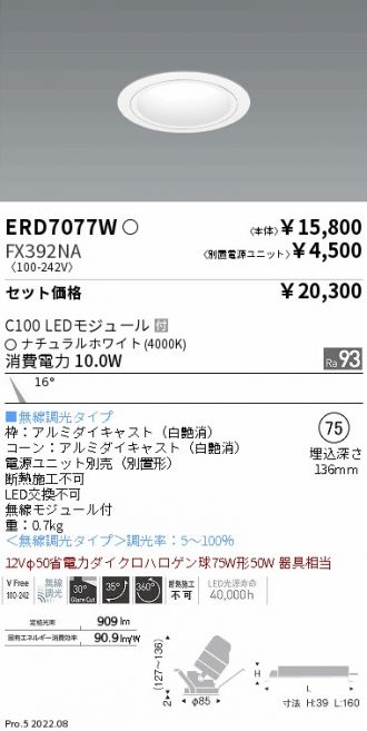 ユニバーサルダウンライト 白コーン Φ75(ERD7077W+FX392NA)