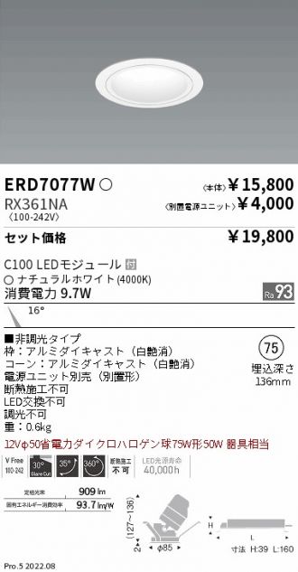 ユニバーサルダウンライト 白コーン Φ75(ERD7077W+RX361NA)