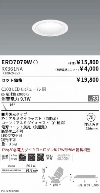 ユニバーサルダウンライト 白コーン Φ75(ERD7079W+RX361NA)