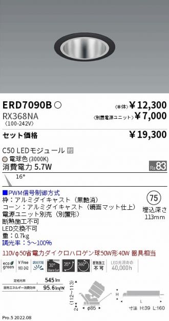 ユニバーサルダウンライト 鏡面マットコーン Φ75(ERD7090B+RX368NA)