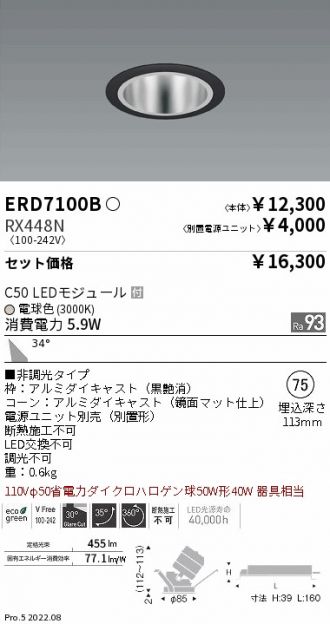ユニバーサルダウンライト 鏡面マットコーン Φ75(ERD7100B+RX448N)