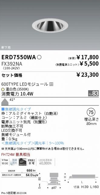 軒下用グレアレス ベースダウンライト Φ75(ERD7550WA+FX392NA)