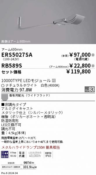 軽量コンパクトスポットライト(看板灯) アーム600mm(ERS5027SA+RB589S)