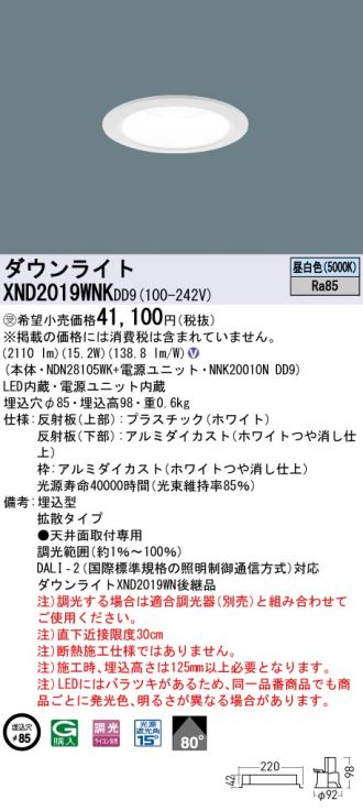 【代金引換不可】天井埋込型 LED(昼白色) ダウンライト ビーム角80度・拡散タイプ・光源遮光角15度 調光タイプ(ライコン別売)/埋込穴φ85 コンパクト形蛍光灯FHT42形1灯器具相当 LED 200形(NDN28105WK+NNK20010NDD9)