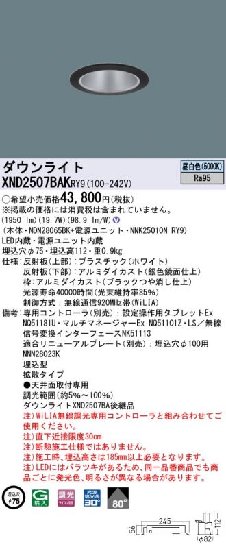 天井埋込型 LED(昼白色) ダウンライト 高演色・ビーム角80度・拡散タイプ・光源遮光角30度 調光タイプ(ライコン別売)/埋込穴φ75 水銀灯100形1灯器具相当 LED 250形(NDN28065BK+NNK25010NRY9)