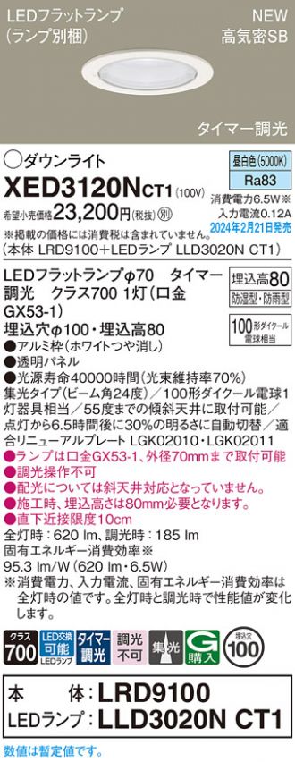 天井埋込型 LED(昼白色) 軒下用ダウンライト・エクステリアダウンライト 浅型8H・高気密SB形・ビーム角24度・集光タイプ LEDフラットランプ交換型・防湿型・防雨型/埋込穴φ100 パネル付型 110Vダイクール電球100形1灯器具相当(LRD9100+LLD3020NCT1)