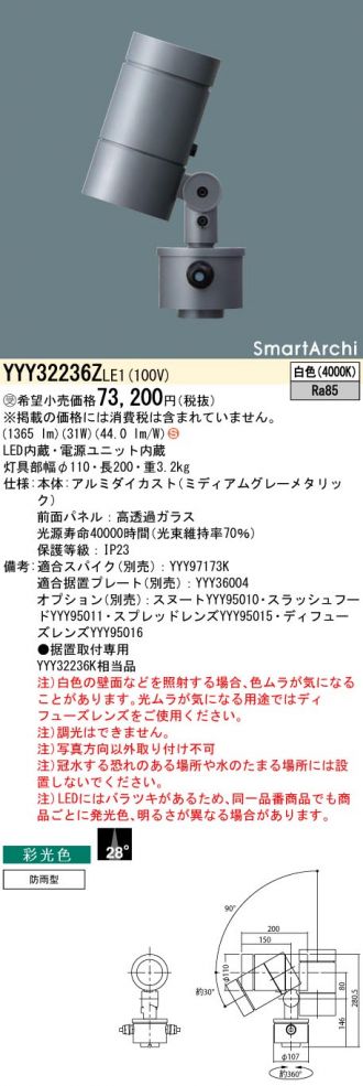 【代金引換不可】据置取付型 LED(白色) スポットライト 彩光色・ビーム角28度 防雨型 SmartArchi(スマートアーキ) シリンダータイプ/パネル付型 2000 lmタイプ
