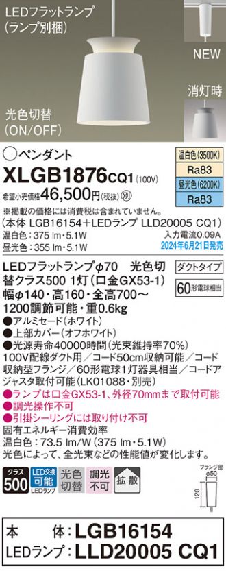 配線ダクト取付型 LED(光色切替) ペンダント アルミセードタイプ・拡散タイプ LEDフラットランプ交換型・光色切替タイプ 白熱電球60形1灯器具相当(LGB16154+LLD20005CQ1)