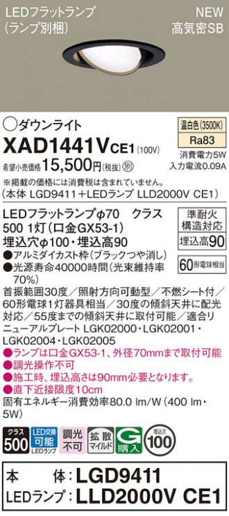天井埋込型 LED(温白色) ユニバーサルダウンライト 浅型9H・高気密SB形・拡散タイプ(マイルド配光) LEDフラットランプ交換型/埋込穴φ100 白熱電球60形1灯器具相当(LGD9411+LLD2000VCE1)