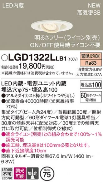 天井埋込型 LED(電球色) ユニバーサルダウンライト 浅型10H・高気密SB形・ビーム角24度・集光タイプ 調光タイプ(ライコン別売)/埋込穴φ75 110Vダイクール電球60形1灯器具相当