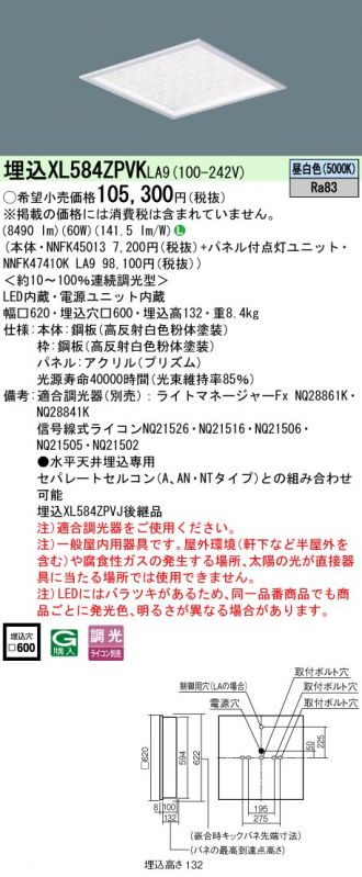 天井埋込型 LED(昼白色) 一体型LEDベースライト きらめきプリズムパネル 連続調光型調光タイプ(ライコン別売) スクエアタイプ/パネル付型 コンパクト形蛍光灯FHP45形4灯器具相当 FHP45形4灯(NNFK45013+NNFK47410KLA9)