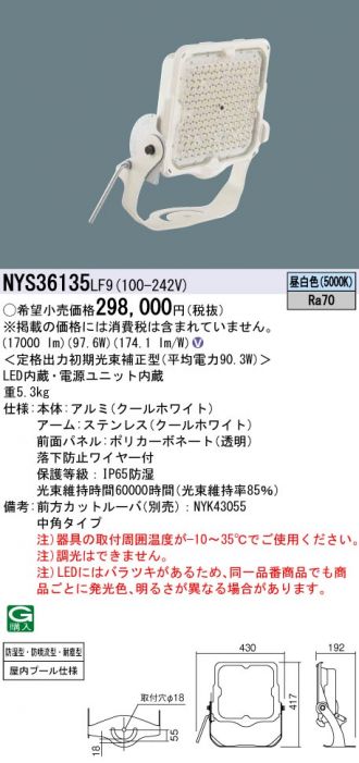 天井直付型・壁直付型・据置取付型 LED(昼白色) 投光器 LED投光器プールビームER・中角タイプ 防湿型・防噴流型・耐塵型・定格出力初期光束補正型 マルチハロゲン灯250形1灯器具相当 250形