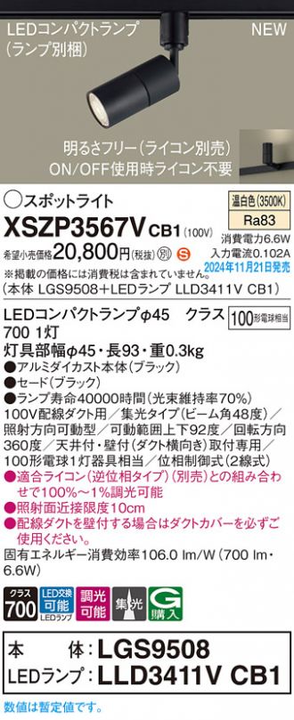配線ダクト取付型 LED(温白色) スポットライト セードタイプ・ビーム角48度・集光タイプ 調光タイプ(ライコン別売) 白熱電球100形1灯器具相当(LGS9508+LLD3411VCB1)