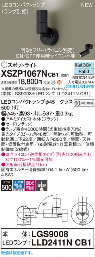 天井直付型・壁直付型・据置取付型 LED(昼白色) スポットライト セードタイプ・ビーム角48度・集光タイプ 調光タイプ(ライコン別売) 白熱電球60形1灯器具相当(LGS9008+LLD2411NCB1)
