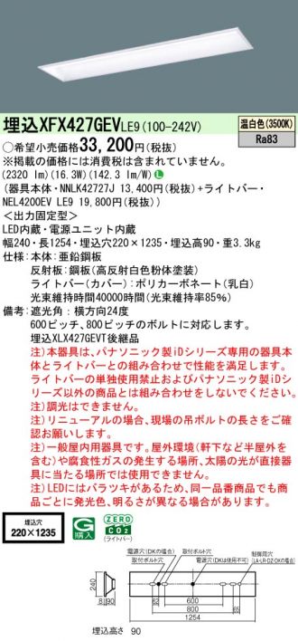学校用 天井埋込型 40形 一体型LEDベースライト スクールコンフォート Hf蛍光灯32形定格出力型1灯器具相当 Hf32形定格出力型・2500 lm(NNLK42727J+NEL4200EVLE9)